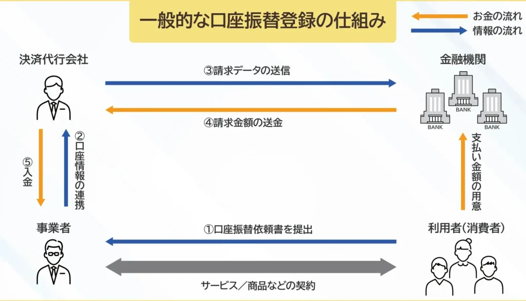 契約者は、サービス提供者と口座振替契約を結びます。これにより、引き落とし対象料金が決定されます。