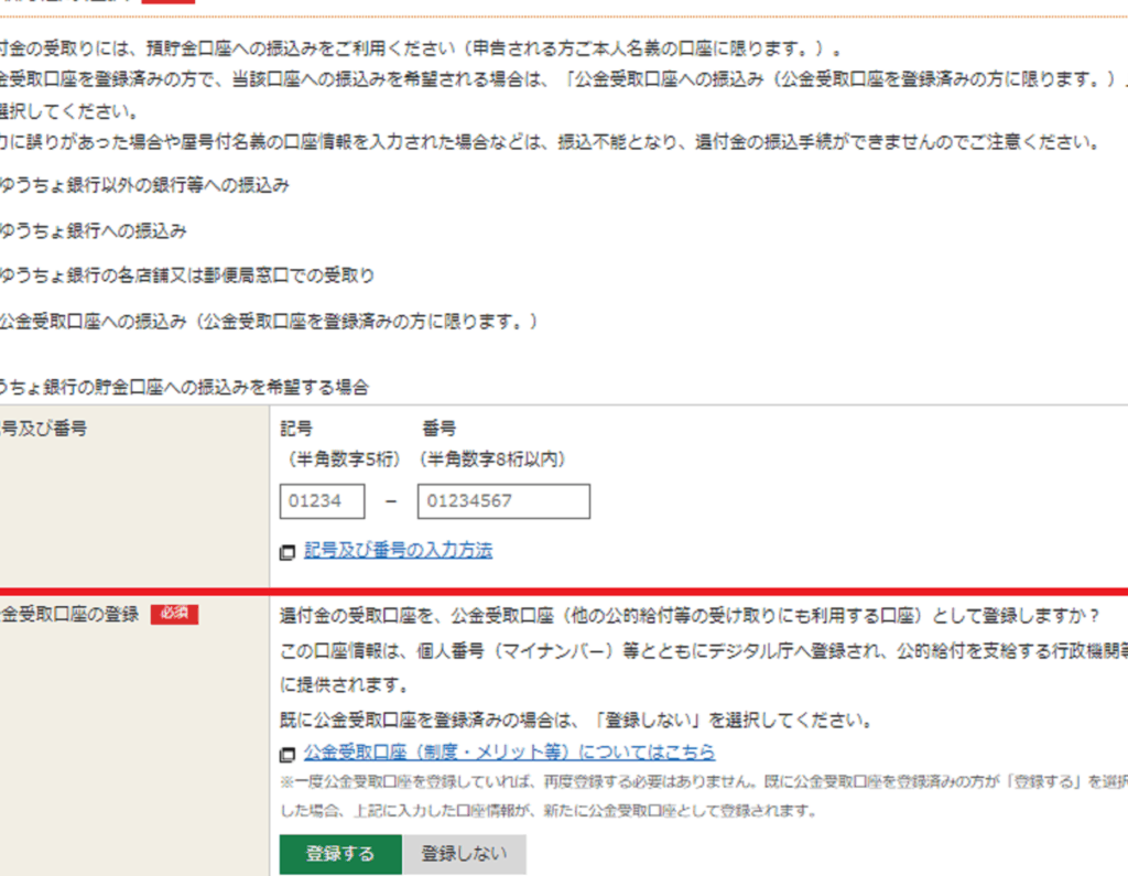 - 口座の利用申し込み: 公金受取用と明示した上で口座を利用する旨を伝える。