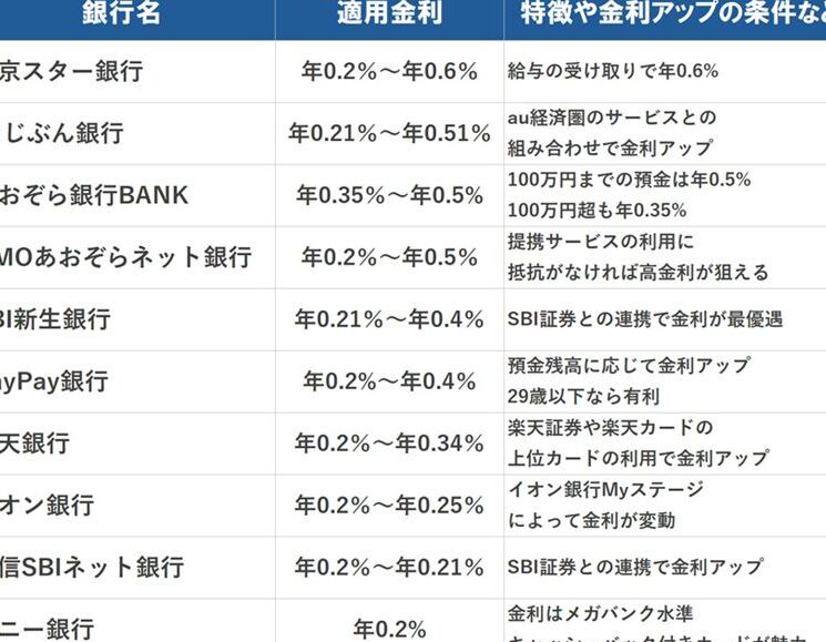利率は口座を選ぶ際に重要な要素です。複数の金融機関の利率を比較しましょう。各金融機関の利率を表にまとめました。