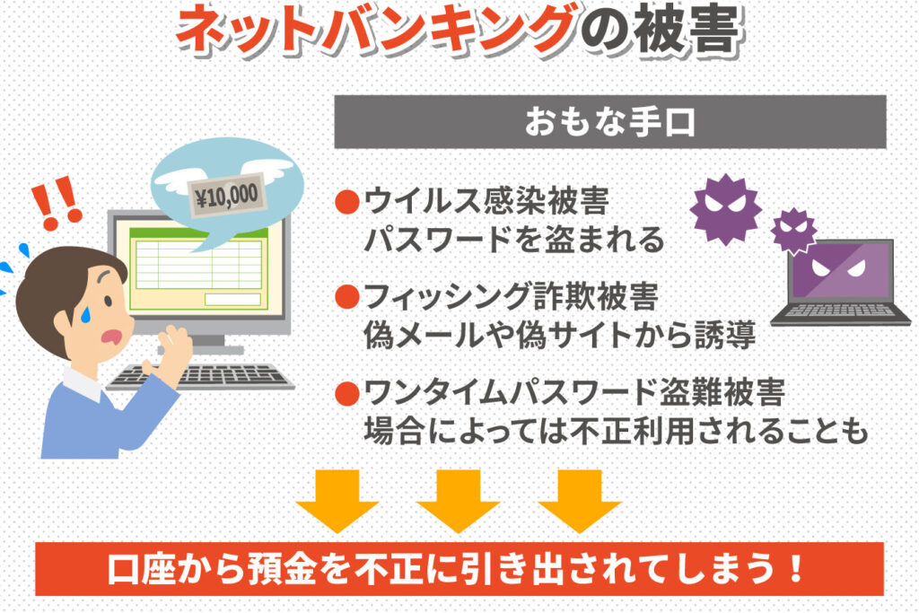 - フィッシング詐欺: 不正なメールやウェブサイトを用いて、個人情報や口座情報を詐取する手法。