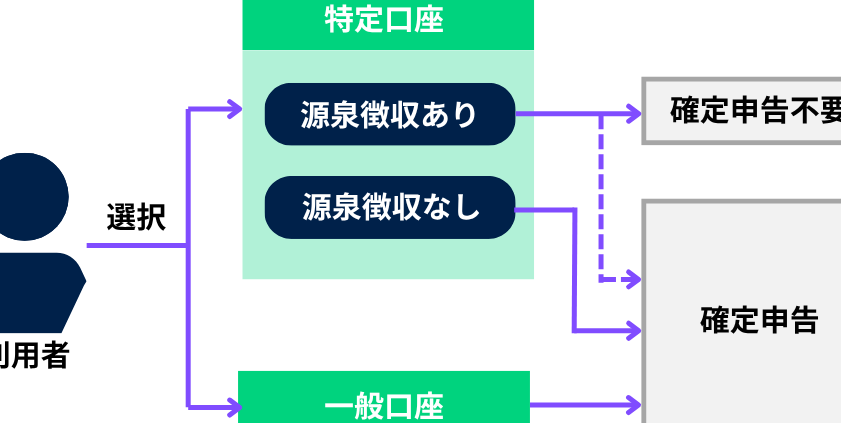 特定口座とは、金融機関が提供する口座で、特に税務処理が簡略化されている。投資家が利用する場合、利益や損失を自動的に計上し、税務署に報告する手続きを金融機関側が行う。これにより、私たち 投資家は自身での税務申告にかかる労力が大幅に軽減される。特定口座は、主に以下の2つのタイプに分類される。
