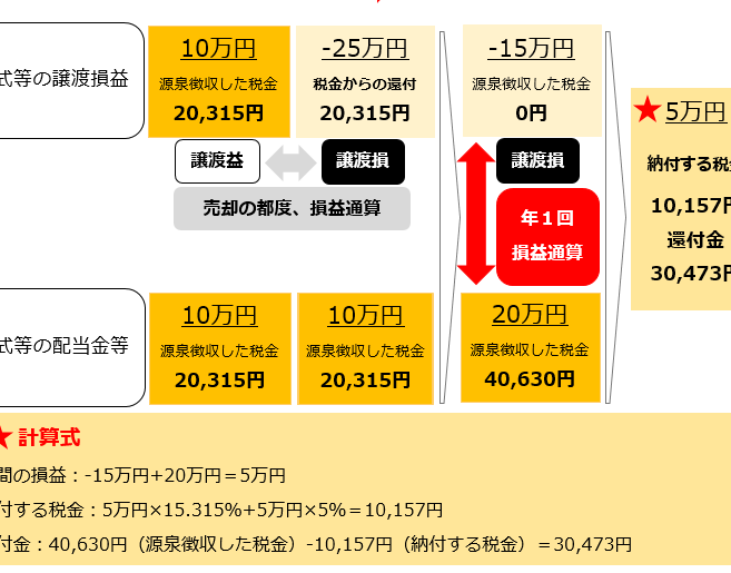 自動的な税金控除は、特定口座の中心的な特徴です。売却益や配当金からは、次のように税金が控除されます。