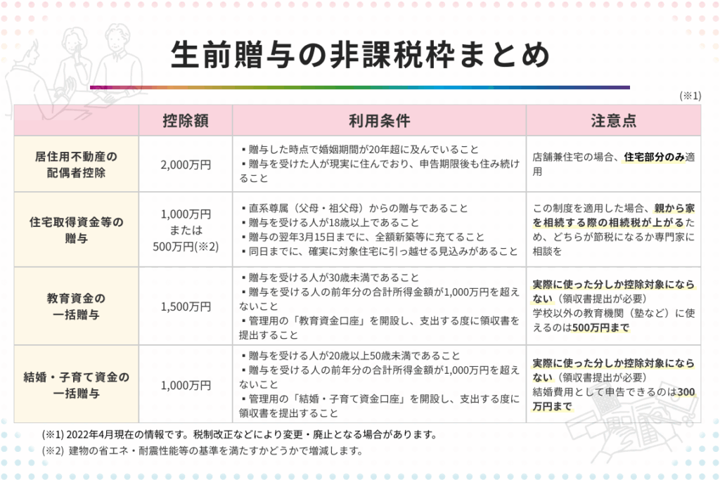 - 課税の対象:課税対象から外れる贈与もありますが、その詳細を正確に把握する必要があります。