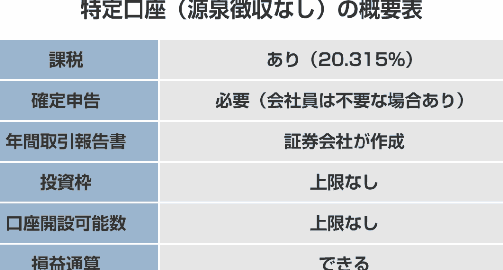 特定口座は、証券会社が提供する口座で、税務処理が自動的に行われるため便利です。この口座には二つの種類があります。